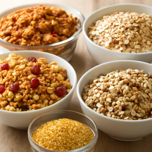 オートミール・押麦・雑穀など、シリアル類のカロリーとたんぱく質。ダイエット中の主食代替に。